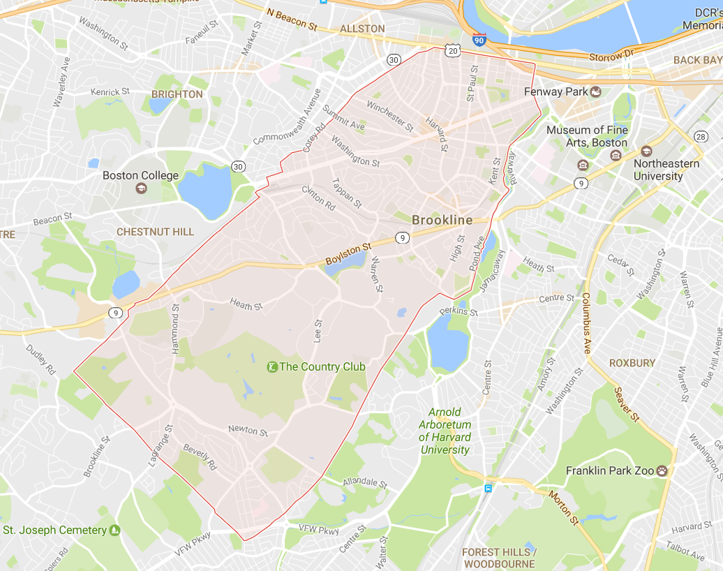 Brookline is located in Norfolk County, on the eastern edge of Newton and just 3 miles west of downtown Boston; in fact, the town borders six of Boston's neighborhoods - Brighton, Allston, Fenway–Kenmore, Mission Hill, Jamaica Plain, and West Roxbury - and includes a seventh, Chestnut Hill! The Mass Pike runs along Brookline's northern tip while Route 9 virtually bisects it. The northern part of Brookline, roughly north of the D-line tracks, is urban in character, highly walkable, and transit rich. The population density of this part of town is nearly 20,000 inhabitants per square mile.
