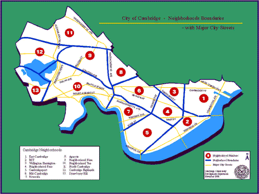 As a resident of Cambridge, you will be known as a Cantabrigian.The diverse mixture of Cantabrigians creates an atmosphere where any family will feel comfortable and at home. The city is beautifully laid out in a series of squares, including Kendall Square, Central Square, Harvard Square, Inman Square, Porter Square, and Lechmere Square. These and the residential areas give you the feeling of being a part of a close-knit, small-town atmosphere. The 13 major residential neighborhoods (see map) making up Cambridge are: