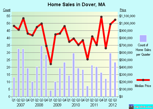 Although Dover sales fell a significant 25% in 2011, and those that did sell beat 2010 values by a whopping 14%, sales shot through the roof in 2012 by more than 100% - but, alas, the average sale price dropped 9%. The good news is that values were still higher than they were in 2010.